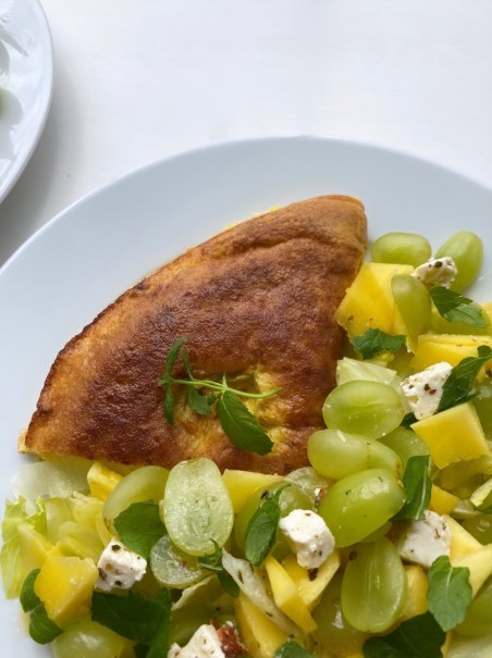 - While the omelet is in the frying pan, on medium to low temperature, cut up the salad, mango, green grapes and add it all into a bowl.